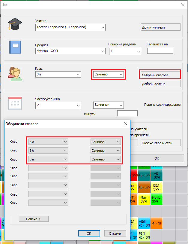 Семинарни часове, където се сливат много на брой класове, са въведени по същия начин, както обикновените сборни класове (с бутон "сборни класове"), само трябва да изберете „Семинари“ като група за всички класове: