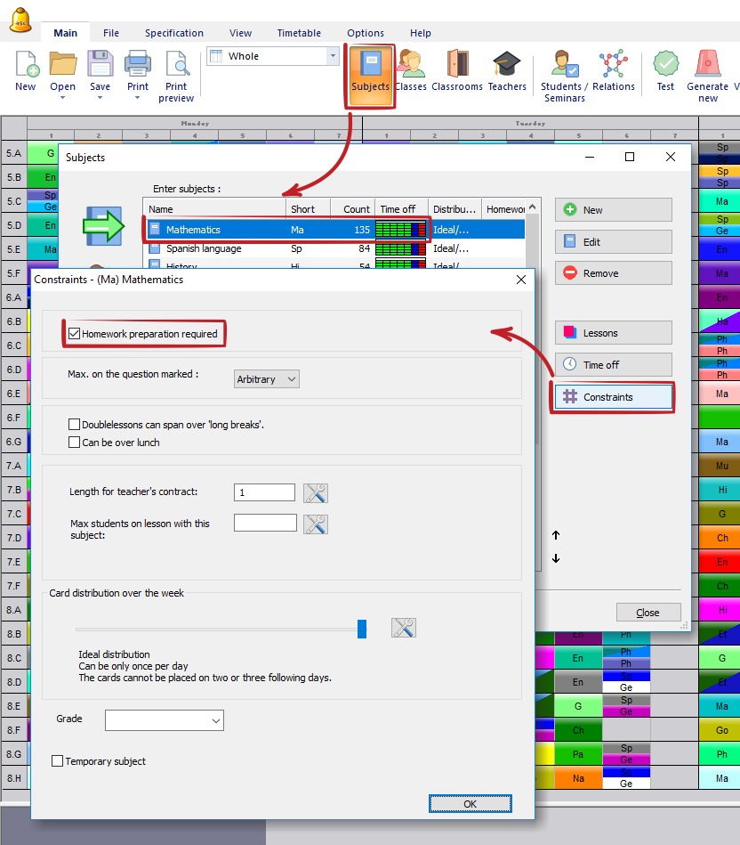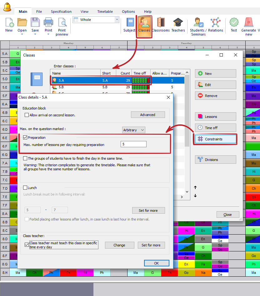 จากนั้นท่านสามารถระบุจำนวนสูงสุดของวิชาที่ต้องเตรียมการบ้านที่สามารถสอนได้ในหนึ่งวัน ท่านสามารถระบุได้ทีละรายการสำหรับทุกชั้นเรียน: