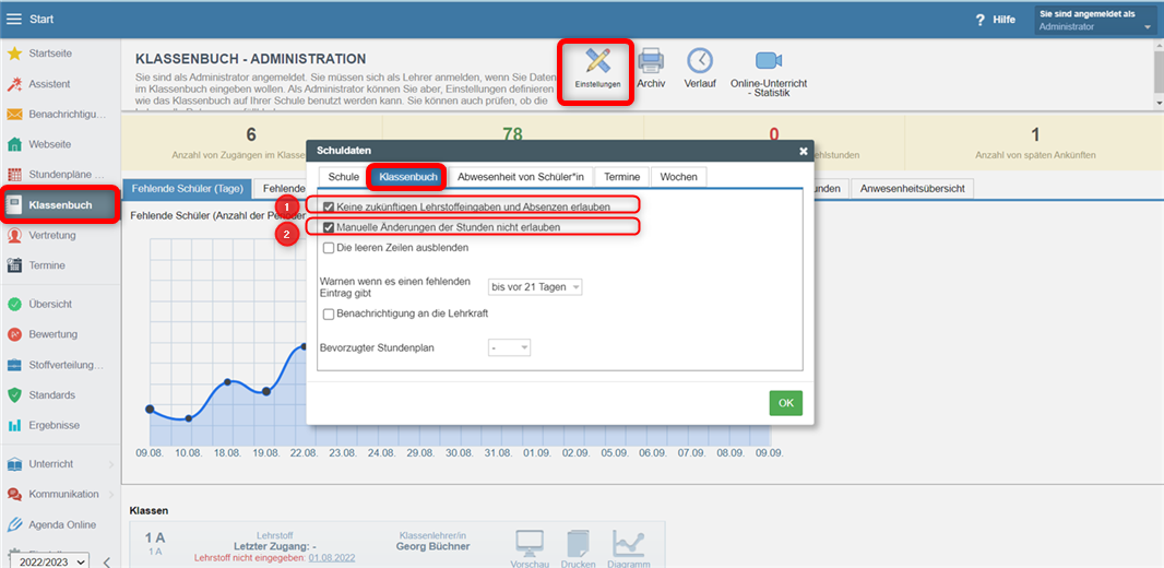 Der Administrator kann in den Klassenbucheinstellungen festlegen, dass