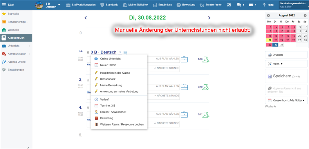 2. die manuelle Änderungen von Unterrichtsstunden im Klassenbuch nicht erlaubt sind :