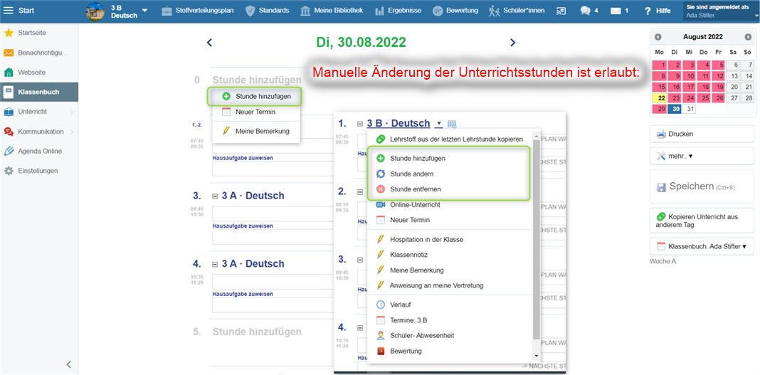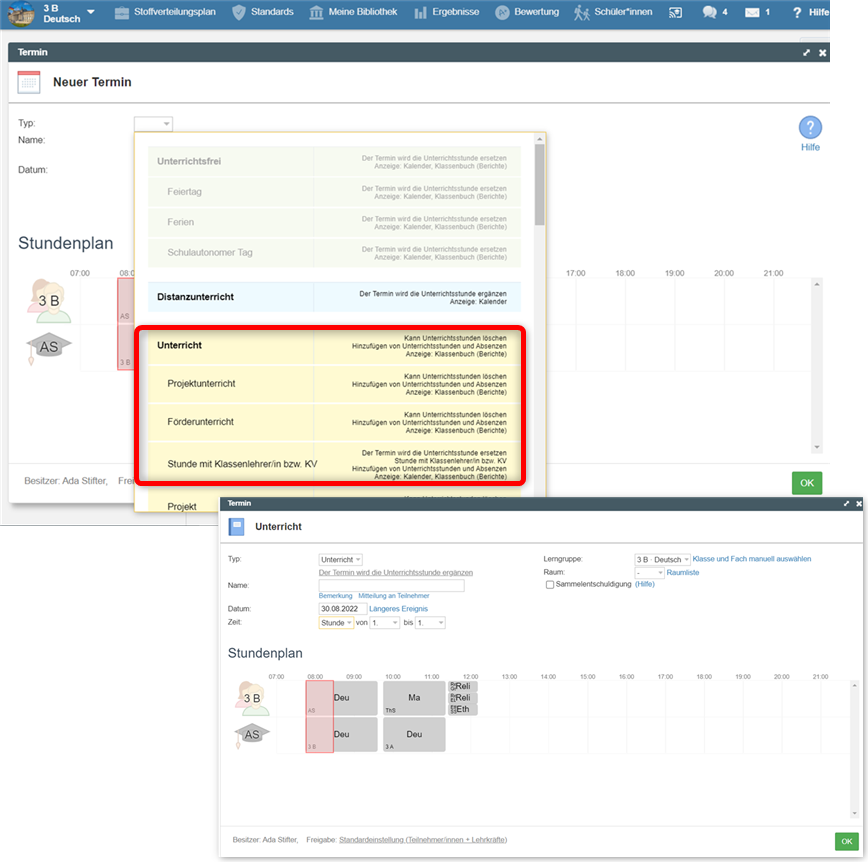 Zum Vergleich, wenn manuelle Änderungen der Unterrichtsstunden erlaubt sind, finden Sie die Optionen "Stunde hinzufügen", "Stunde ändern" und "Stunde entfernen" im Auswahl-Menü und Termine des Typs "Unterricht" sind verfügbar und können eingestellt werden.