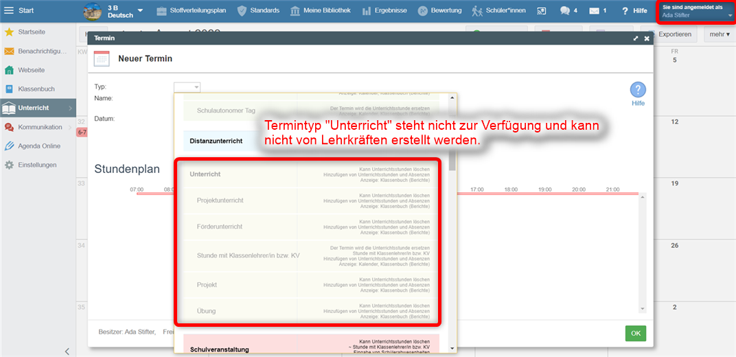 b) Termine des Typs "Unterricht" können nicht erstellt werden.