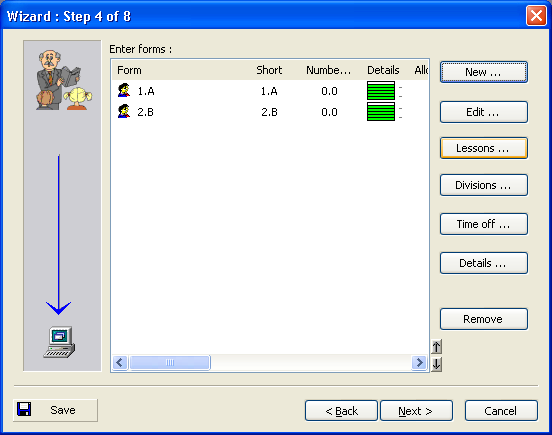 Semejante al paso anterior, aquí puede crear, editar o borrar una clase. Puede entrar otros datos para una clase: Lecciones..., Divisiones... y Tiempo libre.