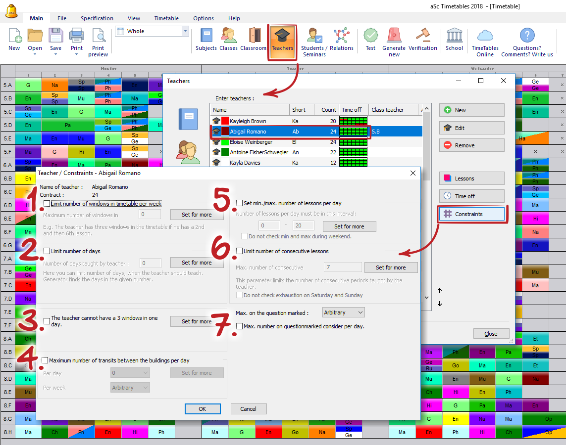6.Limitar número de lecciones consecutivas. Este número especifica el número máximo de lecciones que el profesor puede enseñar sin cesar.