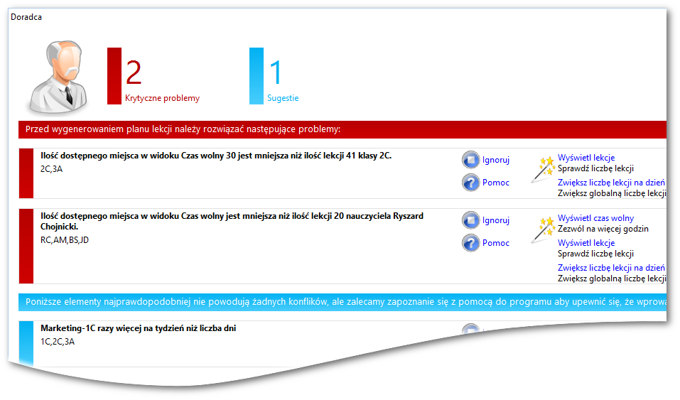 Doradca potrafi teraz wykryć kilka dodatkowych problemów zanim jeszcze rozpocznie się właściwe generowanie planu. Możliwe jest wykrycie m.in. sytuacji, w której występuje zbyt mało zasobów (sal szkolnych, nauczycieli itp.), aby wygenerować żądany plan.