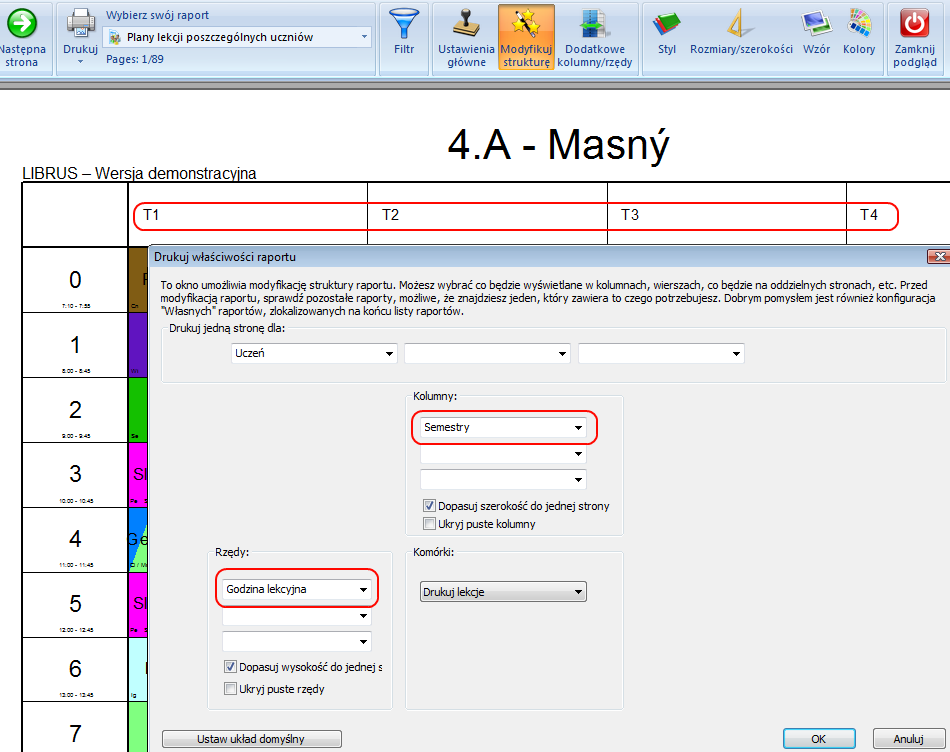 Aby był widoczny taki właśnie plan lekcji należy przejść do zakładki Podgląd wydruku i wybrać opcję Modyfikuj strukturę i ustawić, co ma być wyświetlane w rzędach: