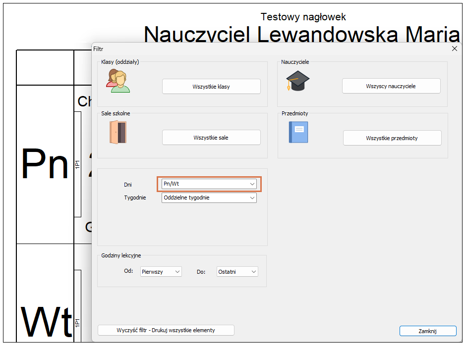 Jeśli Państwa szkoła ma tylko 2 dni - dzień A i dzień B można takie dni zdefiniować w menu Wprowadź -> Szkoła -> Nazwy dni. Następnie należy jedynie upewnić się, że w Filtrze w podglądzie wydruku wybierzemy odpowiednią pozycję: