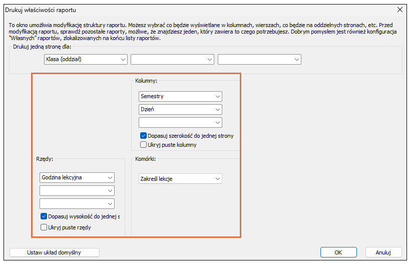 Program wygeneruje wydruk wg Państwa ustawień, na przykład to ustawienia dla raportu 4 semestrów z 2 dniowym tygodniem zajęć: