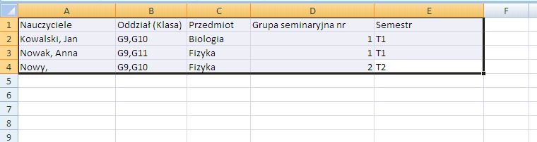 W artykule pokażemy, w jaki sposób zaimportować dane z PRZYKŁADOWEGO pliku w formacie xls do programu Plan Lekcji. Ten przykładowy plik możesz pobrać tutaj Prosimy zwrócić uwagę, iż plik ten zawiera wszystkie informacje (nauczyciele, klasy, przedmioty itd.). Twój plik może zawierać np. tylko przedmioty.