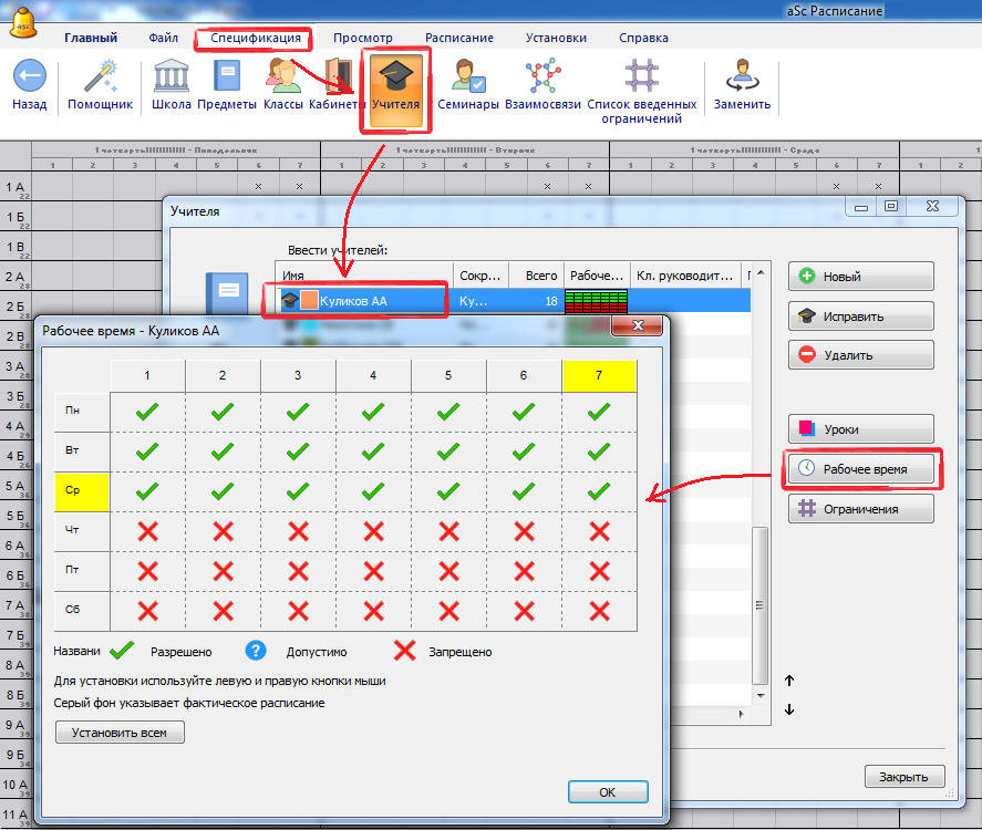 Для каждого учителя Вы можете также определить когда он может, не может, и когда он не предпочитает вести уроки, выбрав "Спецификация / Учителя / Рабочее время":