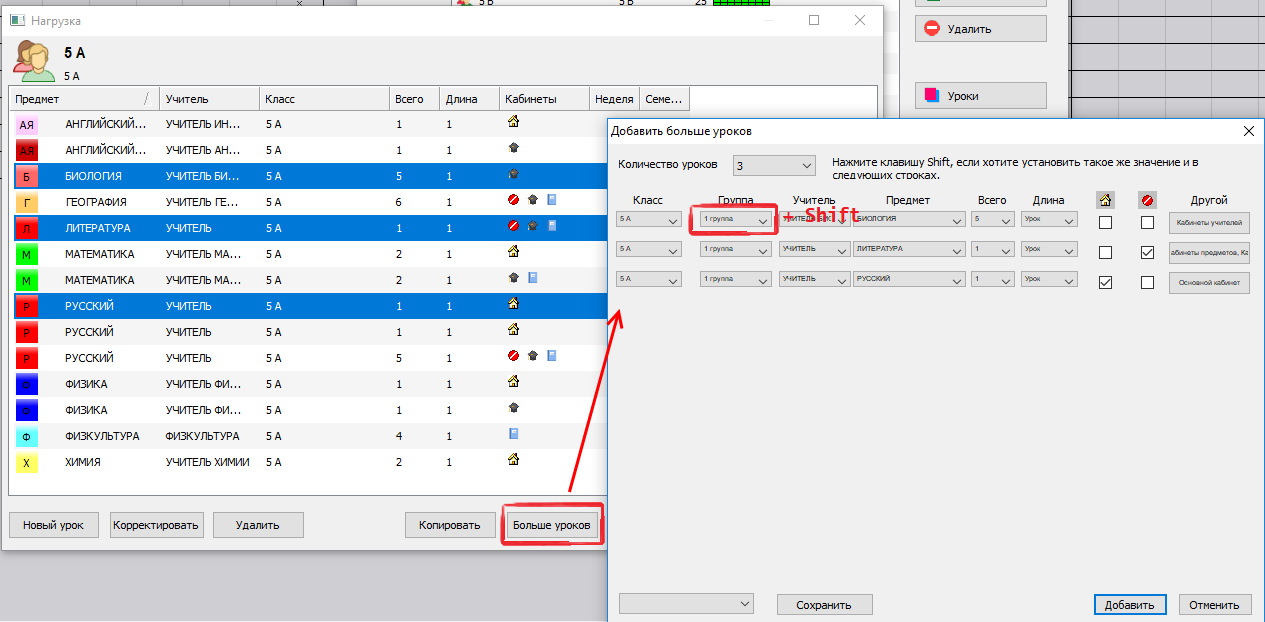 3. Также вы можете выбрать несколько уроков (с Ctrl или Shift) в окне Нагрузок и нажать кнопку "Больше уроков". Выбранные уроки будут автоматически загружены в окно. Затем используйте SHIFT для одновременного изменения данных в колонках и добавьте измененные уроки в расписание: