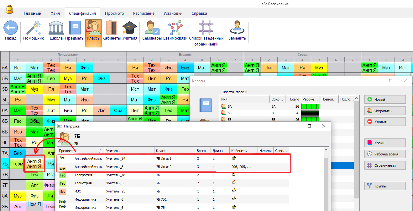 Случай, если предмет тот-же, но два учителя преподает английский для двух групп одного класса: