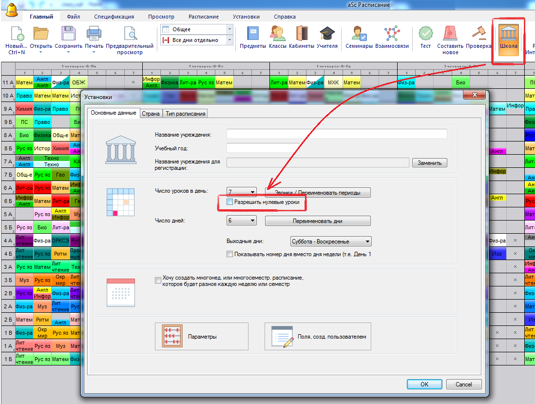 Если Ваша школа не использует нулевые уроки, просто не помечайте опцию "Разрешить нулевые уроки" в меню "Главный / Школа":
