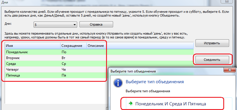 Если школа имеет 2 разные дня: День А и День B, и День А - это понедельник, среда и пятница, а День B - вторник и четверг. Тогда вы можете создать новые дни A и B. Просто используйте кнопку "Соединить":