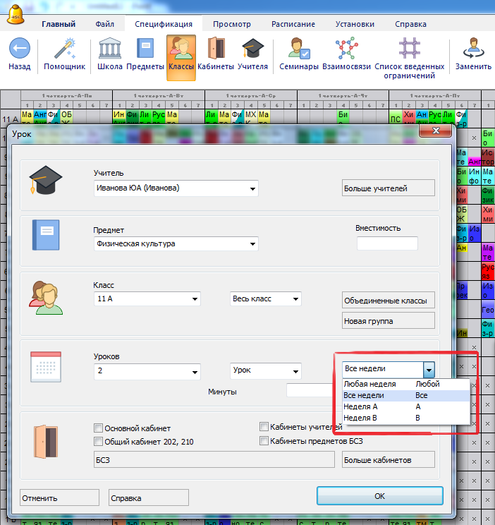 Затем для каждого урока можно указать в которой неделе он может проходить. По умолчанию устанавливается Все недели. Это означает, что урок будет в том же месте во всех неделях. Если выберите Любая неделя, программа поместит этот урок в неделю 1 (А) или 2 (Б).