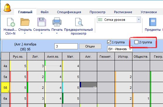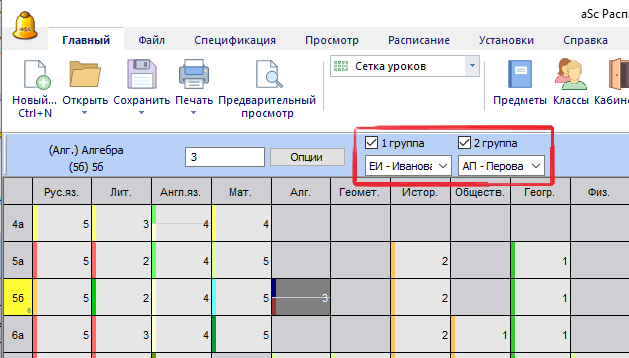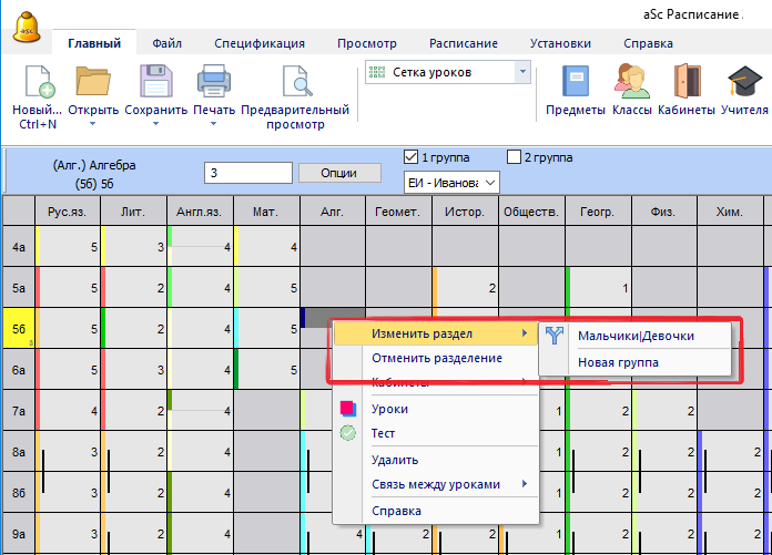 1. Выберите предмет и класс, нажимая на соответствующую ячейку. Напечатайте 3 - число уроков в неделю. Тогда нажмите правую кнопку мышки на созданном уроке и выберите нужное разделение: