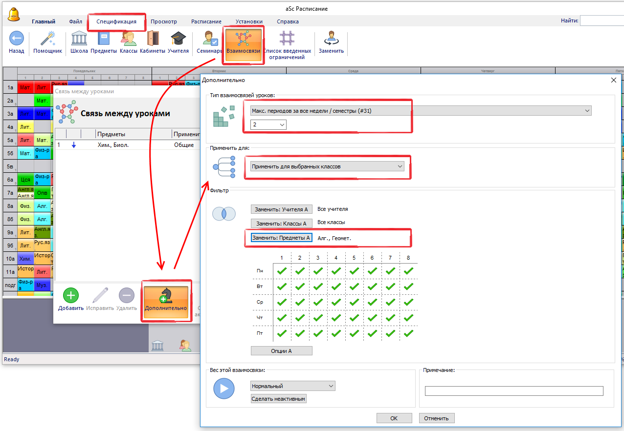 Эта взаимосвязь означает, что может быть не более чем 2 периода (урока) по этим предметам за все недели. Если уроки будут не в то же время, они должны будут занять больше периодов, таким образом, программа должна поставить их в одно время.