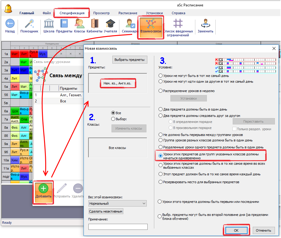 В большинстве случаев это взаимоотношение устанавливать не надо, потому что Вы присваиваете уроки группам, и только группы из того же самого разделения класса могут иметь уроки в то же самое время. Таким образом программа не будет помещать английский язык для группы Англ1 вместе с Физкультурой для группы Мальчиков. См. Деление классов на группы
