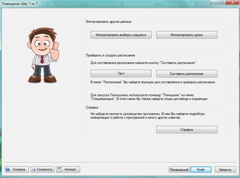 После ввода исходных данных Вы можете начать составление расписания. Нажмите кнопку "Составить расписание", чтобы закончить работу с Помощником и начать автоматическое составление расписание: