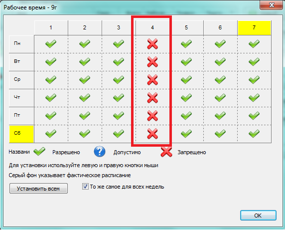 Поэтому необходимо либо разрешить проводить некоторые предметы на 4-ых уроках, либо отметить красными крестиками 4-ые уроки и в рабочем времени классов.