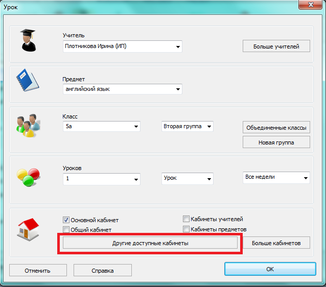 Но, если Вы забыли определить кабинет для учителя, то в результате обе группы могут обучаться только в основном кабинете. Другими словами, эти два урока не могут быть расположены в то же самое время, так как они требуют один и тот же кабинет.