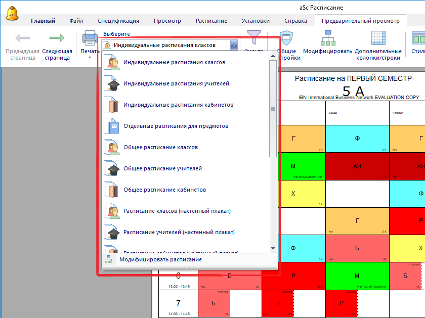 Вы также можете использовать иконки для изменения формата выбранного расписания.