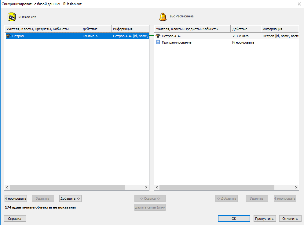 Теперь, если учителя, предметы, классы имеют названия, одинаковые в обоих файлах, программа автоматически свяжет их. Если они названы по-разному, Вы можете указать, будет ли новый объект добавлен или связан (то есть это тот же учитель, предмет, только назван по-другому).