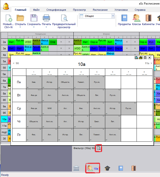 Например, для 5А остался один не помещенный урок, а урок по математике - пока без кабинета (серого цвета):