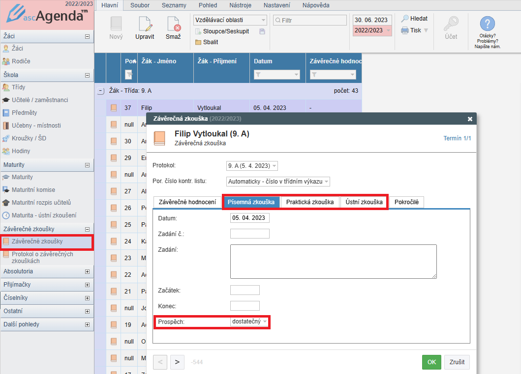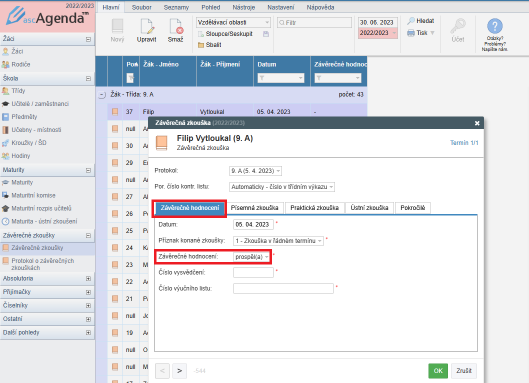 Ak žiak nezúčastnil zaverečnej skúšky npar. z dôvodu choroby, tak vyplňte záverečné hodnotenie pomocou pomlčky: "-" a takáto zaverečná skúška sa do exportu MŠMT ani nebude exportovať.