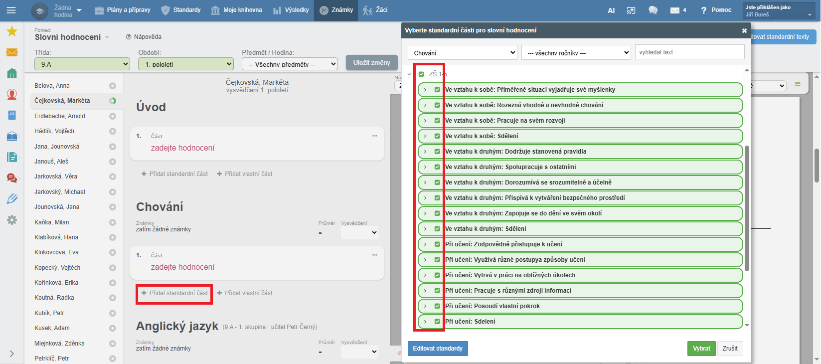 a zadejte standardy z předmětu "Chování" přes "Přidat standardní část", zde můžete zvolit, které ze standardů budete hodnotit: