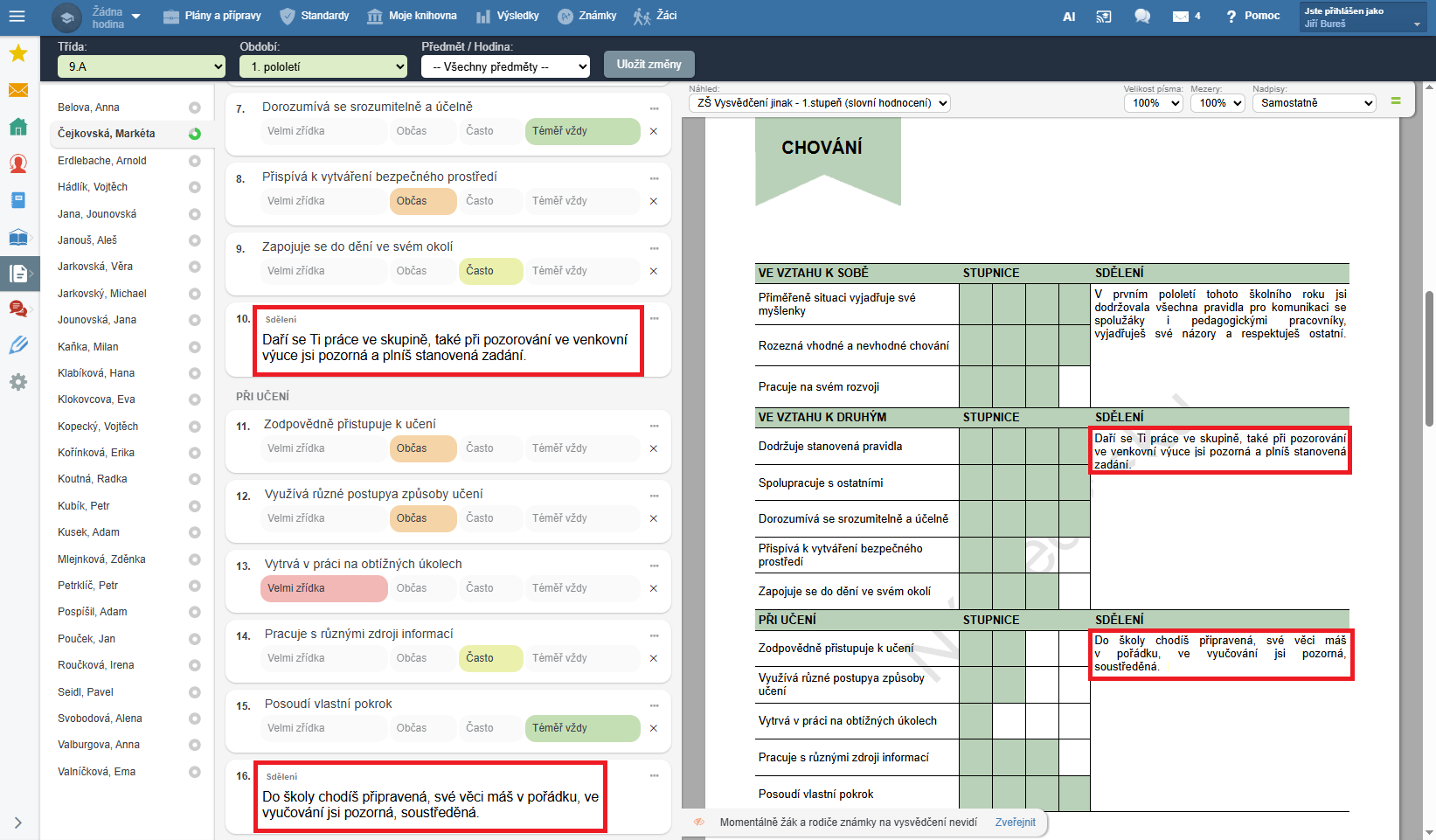 Jak může třídní učitel hodnotit standardy chování na vysvědčení?