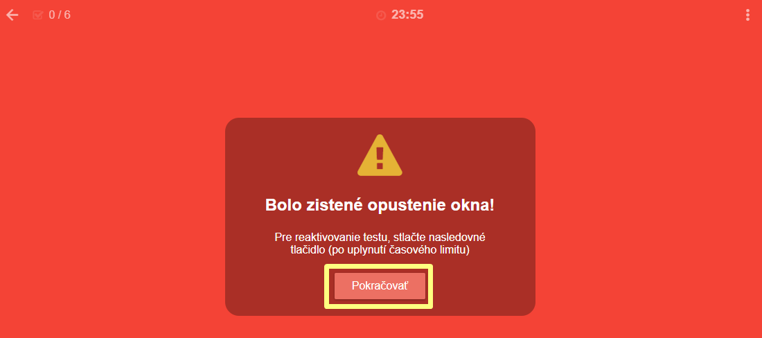 Ak žiak počas testu opustí okno testu (napr. sa preklikne do iného okna), test sa žiakovi zablokuje, obrazovka sa vyfarbí na červeno a objaví sa hláška "Bolo zistené opustenie okna!"