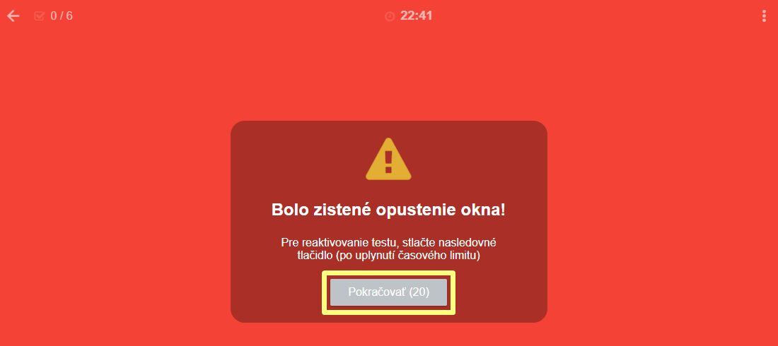 Test je na 20 sekúnd zablokovaný, po stlačení tlačidla Pokračovať v tlačidle začne odpočítavanie 20 sekúnd. Akékoľvek ďalšie opustenie okna počas odpočítavania spôsobí, že sa začne 20 sekúnd opäť odpočítavať znova.