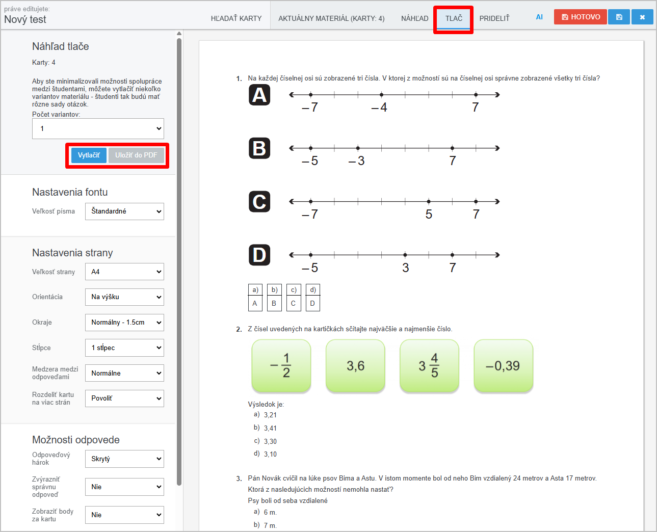 Materiál, ktorý máte v EduPage (test, prezentácia, DÚ, projkt), si viete vytlačiť alebo vyexportovať do PDF v záložke Tlač.
