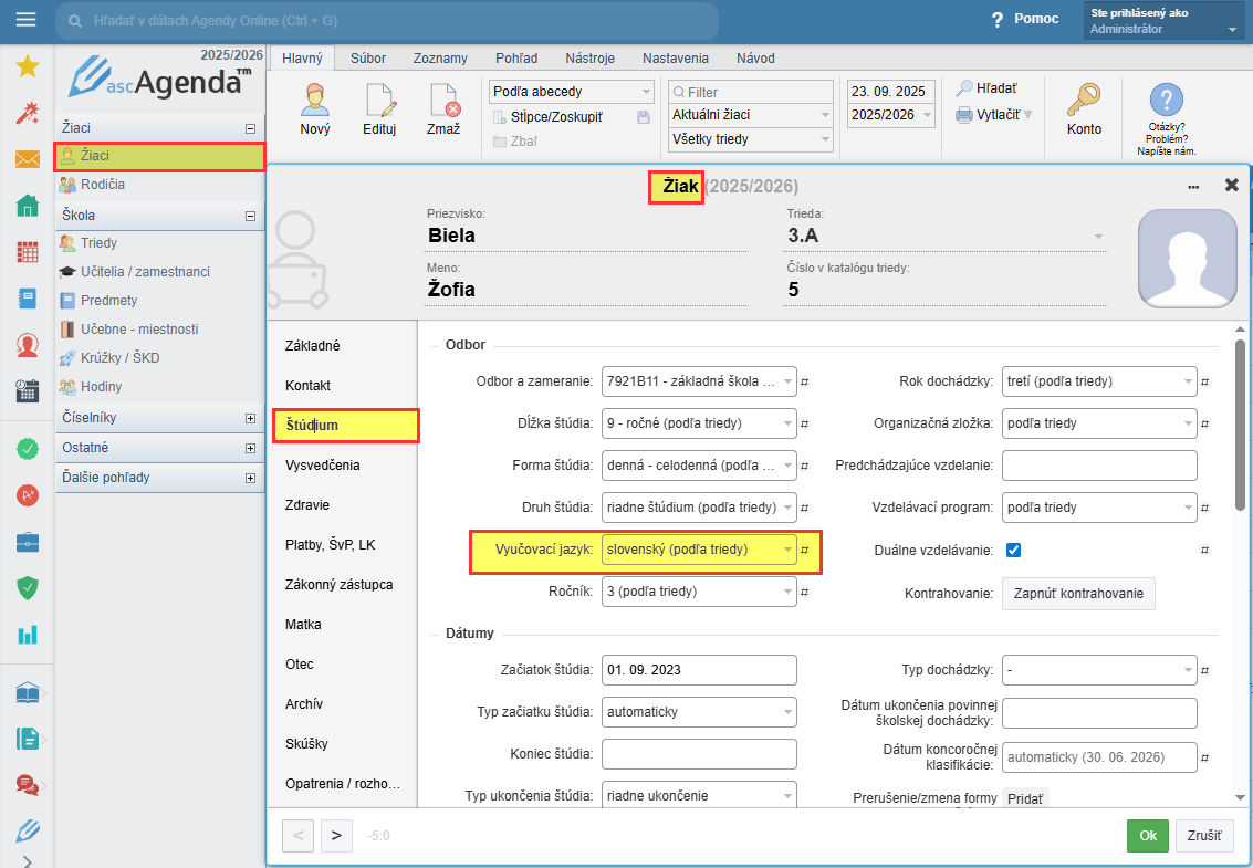 Ak má žiak z nejakého dôvodu iný vyučovací jazyk, ako trieda, tak ho viete nastaviť individuálne v karte žiaka.