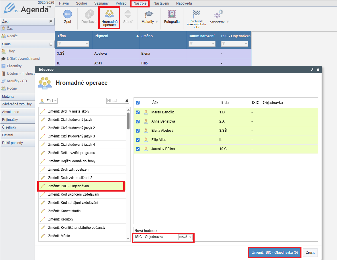 Viacerím žiakom naraz môžete stav objednávky preukazu ISIC "Nová" priradiť označením príslušných žiakov a cez "nástroje - Hromadné operácie - Změnit Isic - Objednávka", kde označíte stav objednávky "Nová":