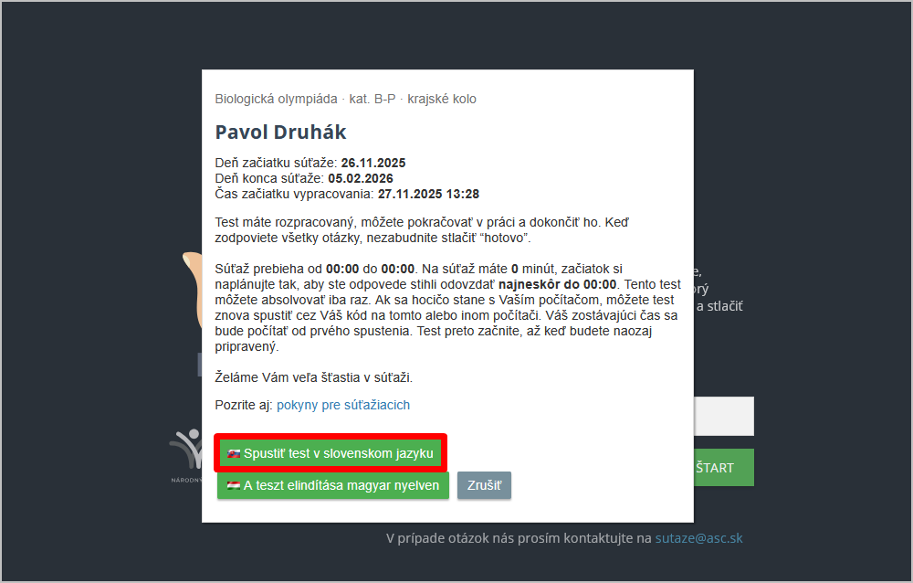 Na súťažnej stránke www.onlineolympiady.sk je potrebné vložiť kód súťažiaceho a stlačiť ŠTART:
