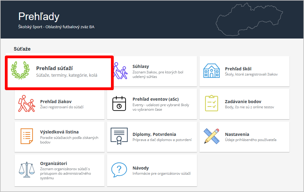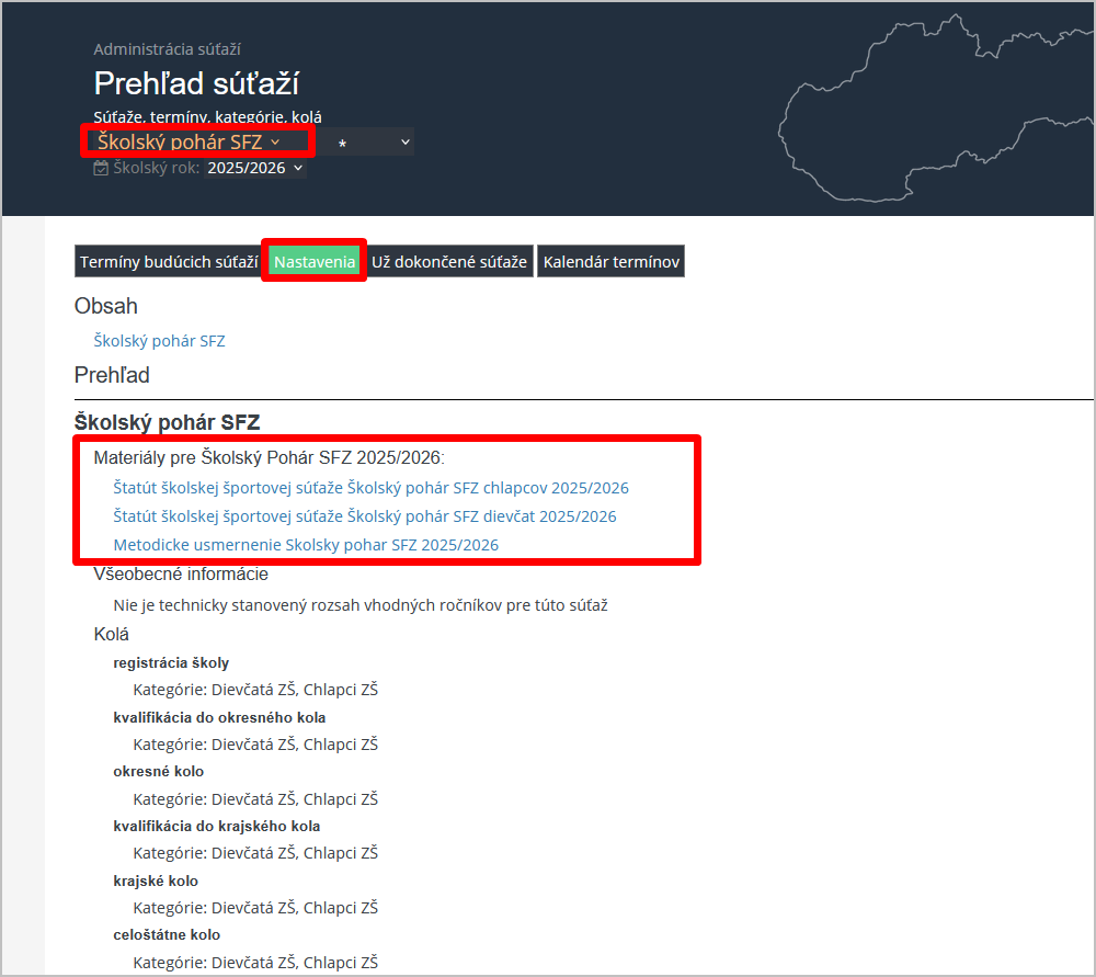 V časti "Prehľad súťaží", po výbere konkrétnej súťaže (ak má organizátor prístup k viacerým súťažiam), v časti Nastavenia nájdete všetky potrebné dokumenty potrebné k realizácii súťaže: