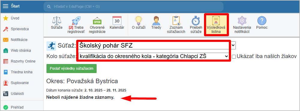 Po zadaní bodov a následnom vytvorení výsledkovej listiny ju zverejní orgnizátor individuálne pre každú súťaž/turnaj samostatne. Kým nie sú zadané výsledky a organoizátor VL nezverejní, nevidíte výsledky v školskom EduPage.