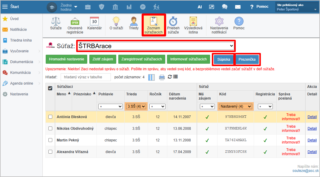 V časti Zoznam súťažiacich kliknite na "Súpiska" a "Prezenčka":