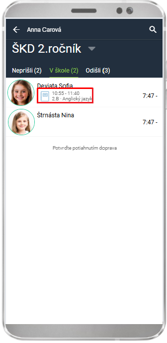V module na evidenciu dochádzky v ŠKD Príchody/odchody študentov EduPage zobrazuje pod menom žiaka aj jeho aktuálnu hodinu, ak je odlišná ako tá Vaša, tzn. uvidíte, že žiak má ešte vyučovaciu hodinu/krúžok, preto sa nenachádza vo Vašej triede:
