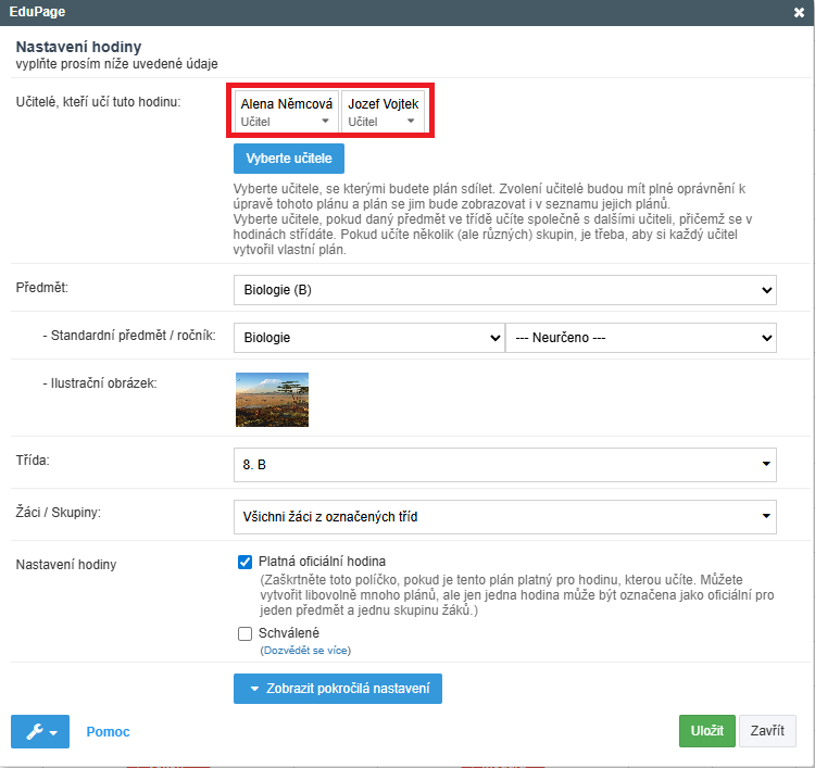 2. Následne je potrebné vytvoriť len jednu "moju hodinu" v EduPage s oboma učiteľmi: Ako zmeniť nastavenia hodiny?