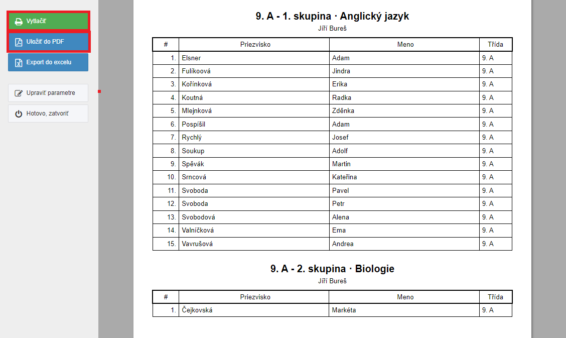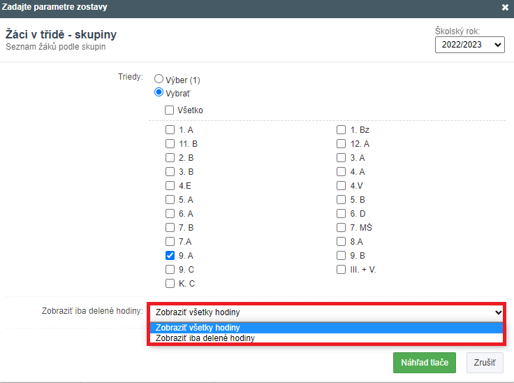 keď si vyberiete delené "hodiny", tak sa vám vygeneruje zoznam skupín v danej triedy so zoznamom žiakov v danej skupine, túto zostavu si možete zobraziť alebo uložiť do pdf, alebo vytlačiť