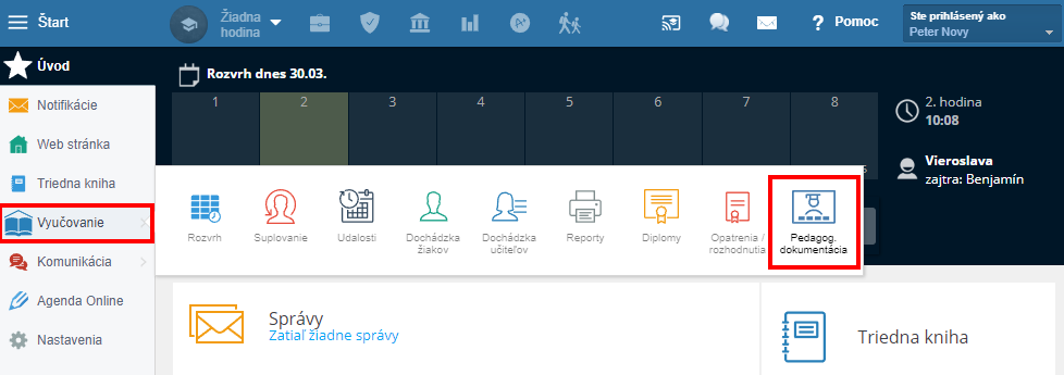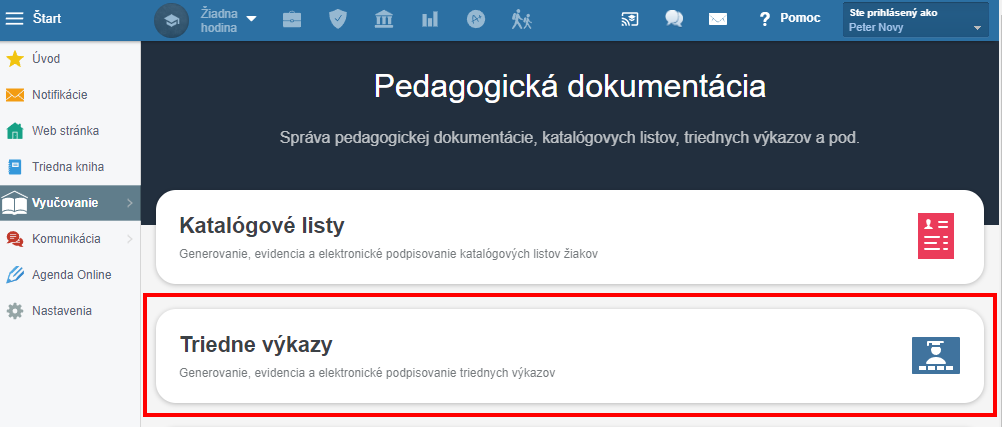 Vo svojom učiteľskom konte v ľavom menu vyberte záložku "Vyučovanie" a v nej možnosť "Pedagogická dokumentácia".