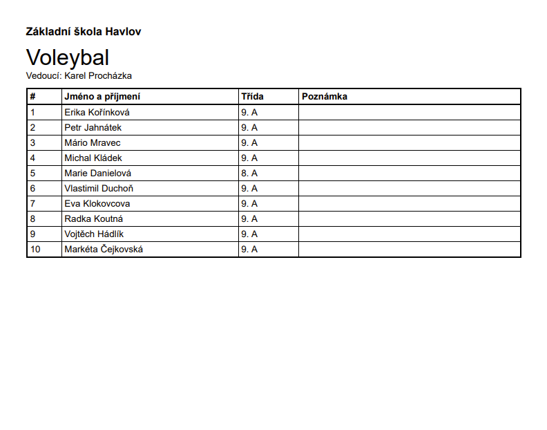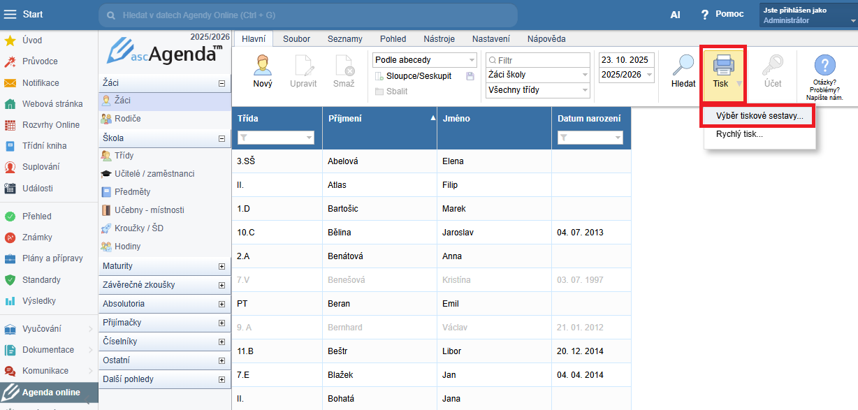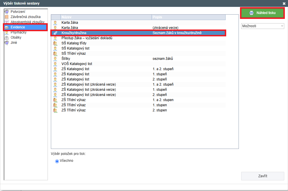 Tlačovú zostavu zoznam žiakov v krúžkoch/ŠD nájdete v Agende Online: "Tisk - výběr tiskové sestavy":