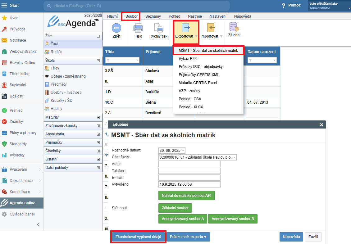 Pred exportom dát do MŠMT: Export do MŠMT - Sběr dat ze školních matrik si môžete spusiť kontrolu vyplnenia údajov priamo v EduPage.