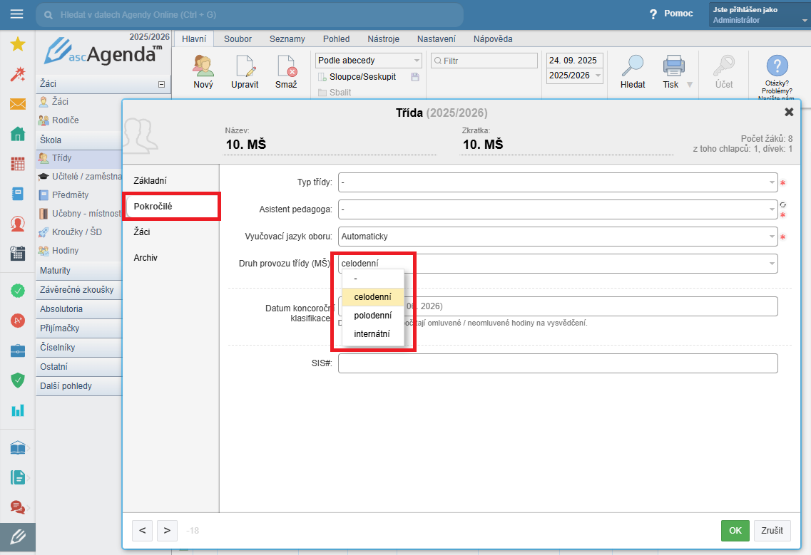 Druh prevádzky triedy MŠ môžete nastaviť v agende onine v karte triedy v položke pokročilý: