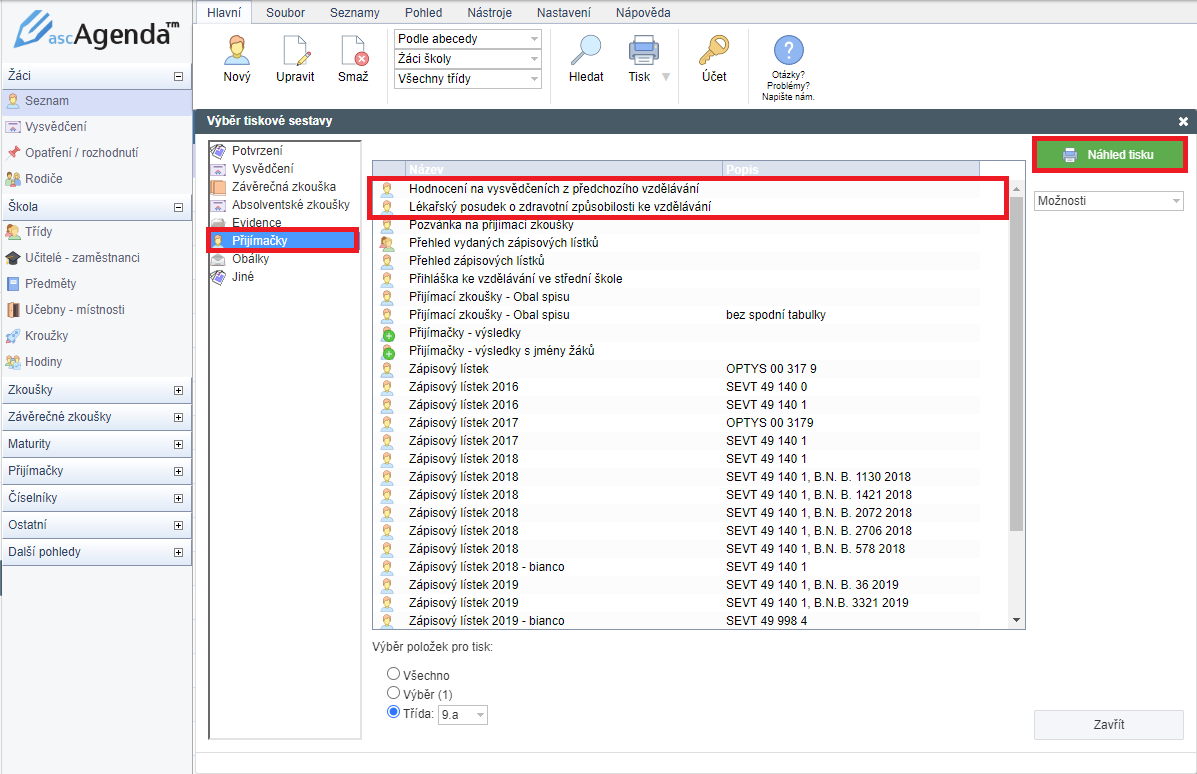 V Agendě Online můžete jako administrátor pomocí tiskové sestavy „Hodnocení na vysvědčeních z předchozího vzdělávání“, která obsahuje výpis známek pro přihlášky na střední školy, v sekci Přijímačky vygenerovat danou sestavu: