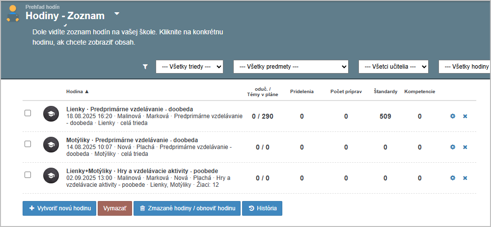 1. Najskôr treba vytvoriť hodiny. V našom prípade vytvoríme 3 hodiny, dve pre dopoludňajšie vzdelávanie a jednu pre popoludňajšie vzdelávanie. Hodiny pre dopoludňajšie vzdelávanie sú pre každú triedu zvlášť.
