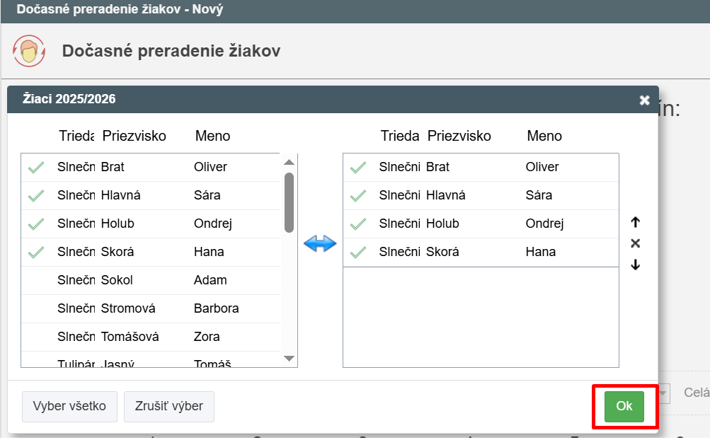 Vyberieme deti, ktoré chceme dočasne preradiť, triedu do ktorej ich preraďujeme, časové obdobie a hodinu .